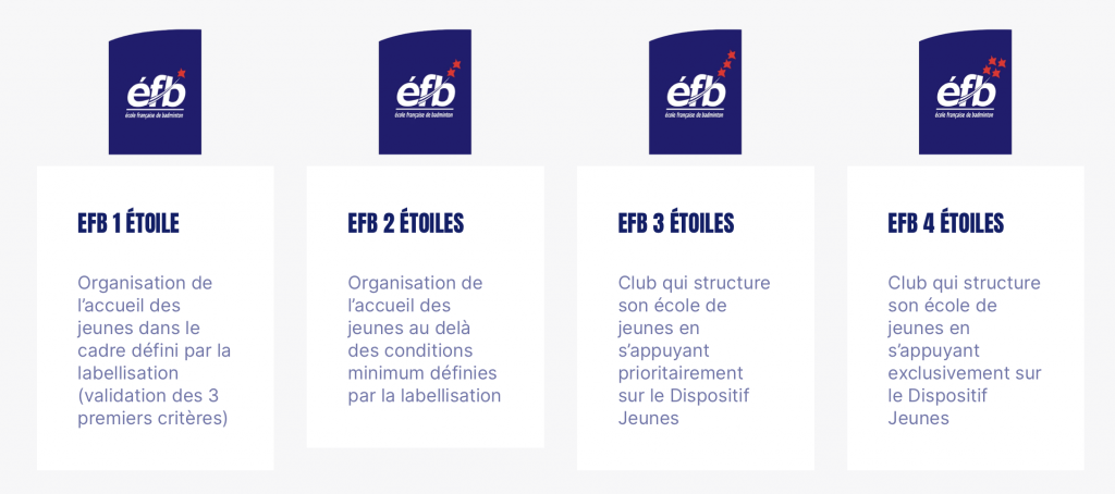 Les Écoles Françaises de Badminton se déclinent en différents niveaux de labellisation. Ces niveaux s’échelonnent de 1 à 5 étoiles selon des critères fixés par la FFBaD.