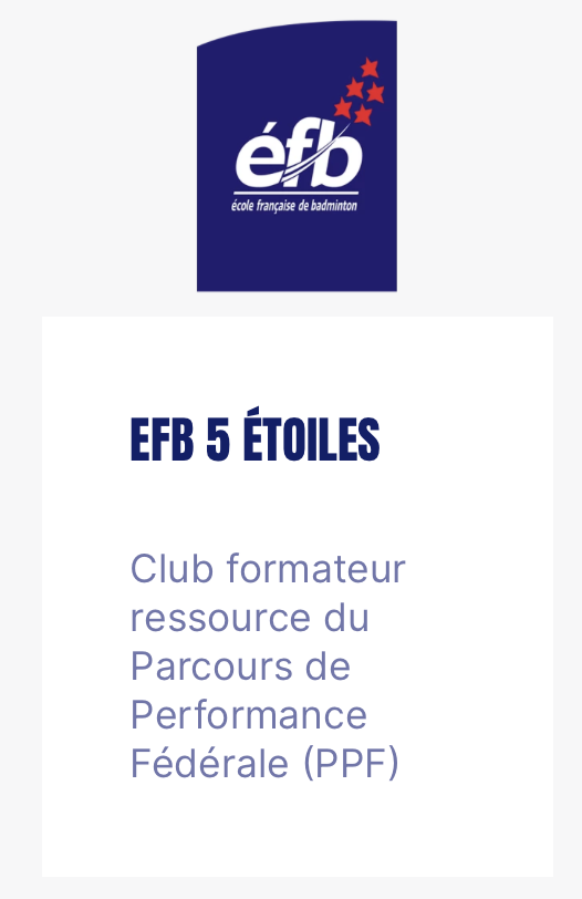 Une École Française de Badminton (EFB) réserve un accueil de qualité aux jeunes de 6 à 17 ans dans des créneaux spécifiques par âge et par niveau. L’encadrement des séances est assuré par des éducateurs diplômés, reconnus par la FFBaD. L’École Française de Badminton permet de progresser et de participer aux premières compétitions.