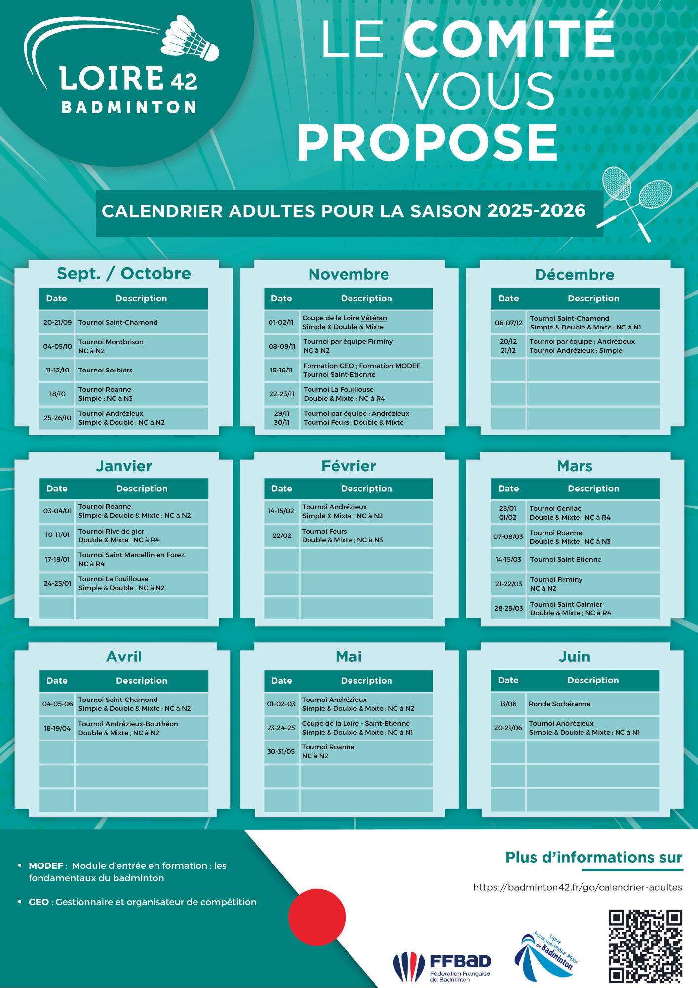 Calendrier Tournois Adultes Loire 2025 – 2026 Vous pouvez télécharger le calendrier via ce lien : Calendrier Adulte 2025-2026