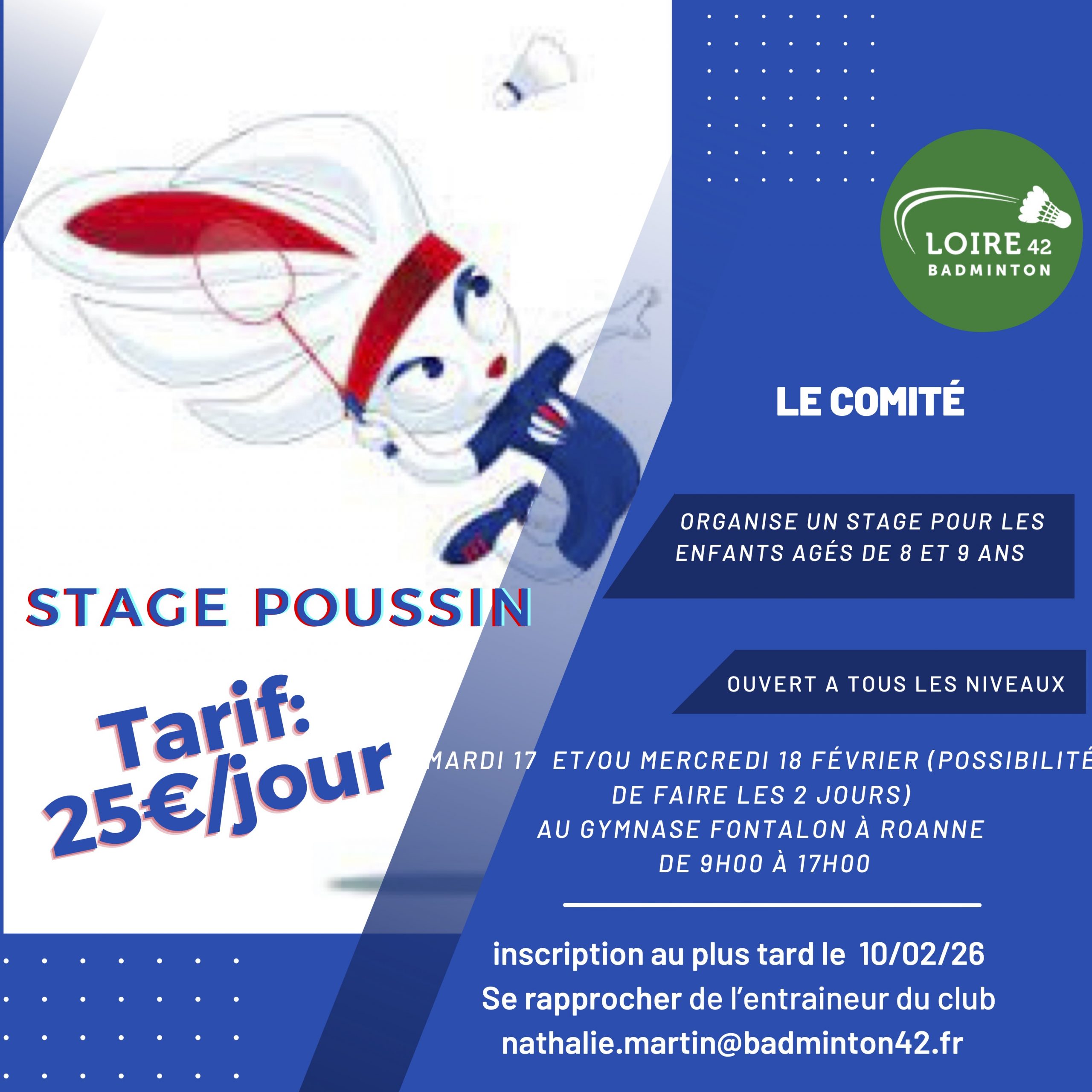 Bonjour, Voici les informations concernant le stage poussin organisé par le comité de la Loire de badminton, qui se déroulera à Roanne pendant les vacances de février. Il y a la possibilité d' emmener quelques enfants , merci de demander …